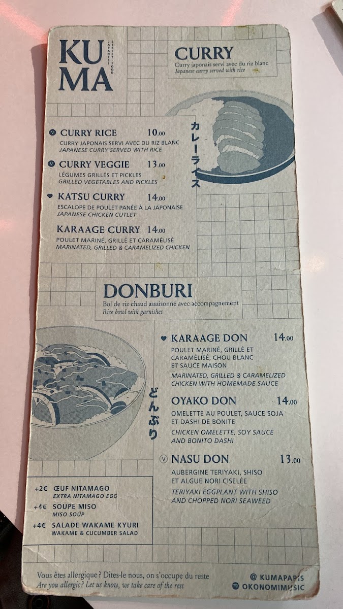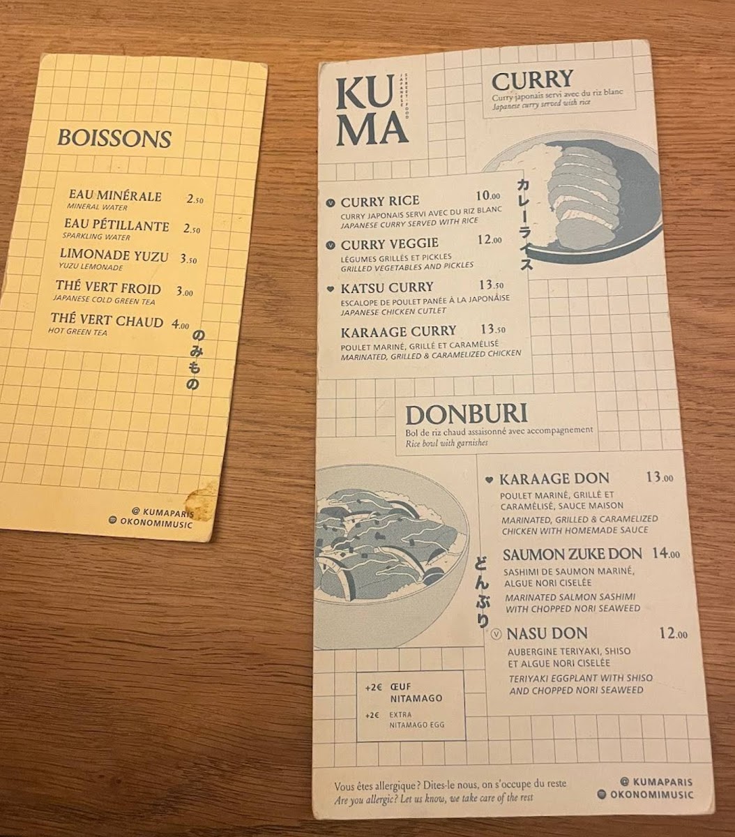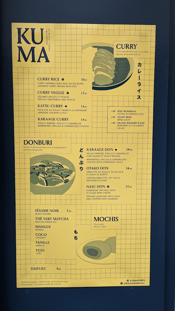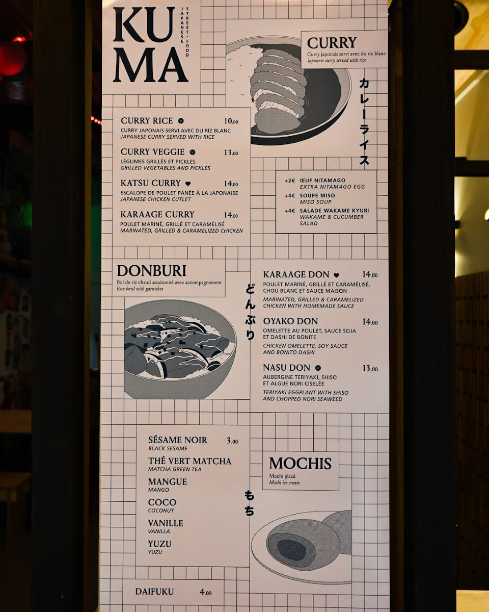 The menu at KUMA - Cadet offers a selection of traditional Japanese dishes with a focus on Japanese curry varieties. Visitors can find different curry options such as Katsu Curry, Karaage Curry, and vegetarian curry choices. Alongside these, there are rice bowl dishes like Oyako Don and Nasu Don, as well as vegetable-based bowls labeled Don Veggie.