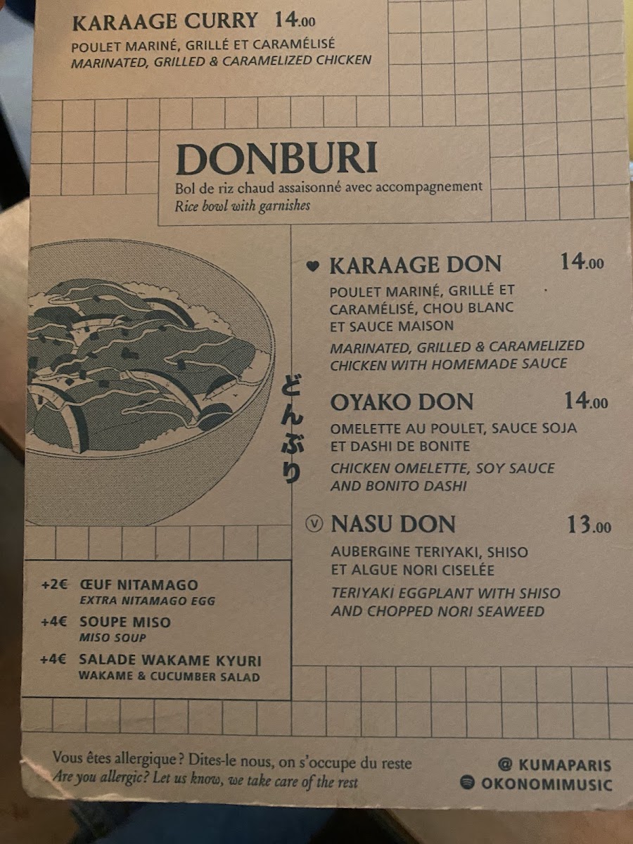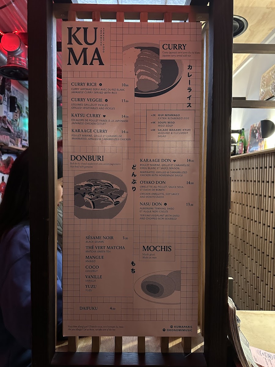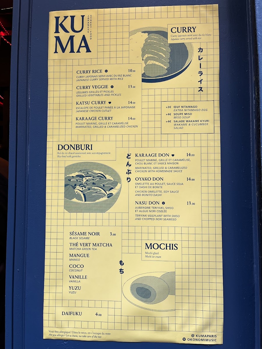 The menu at KUMA - Cadet offers a selection of traditional Japanese dishes with a focus on Japanese curry varieties. Visitors can find different curry options such as Katsu Curry, Karaage Curry, and vegetarian curry choices. Alongside these, there are rice bowl dishes like Oyako Don and Nasu Don, as well as vegetable-based bowls labeled Don Veggie.
